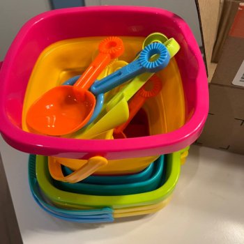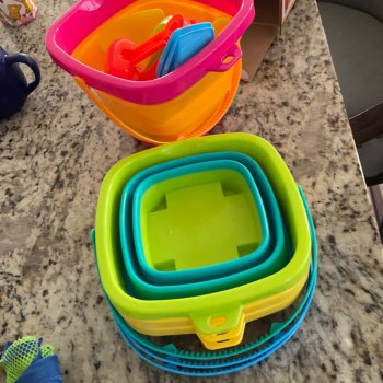 This sand toy set has brought so much joy to our family outings! It's complete with everything you need for fun in the sun - buckets, molds, shovels...you name it! And everything folds flat which is great when packing for a day out or vacationing. The bright colors are still vibrant after many uses too!