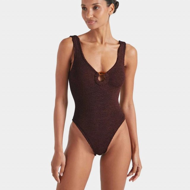 Whether you’re sunbathing on a boat deck or sipping cocktails at a beach resort, this versatile one-piece swimsuit brings sophistication to your summer wardrobe. The metallic decorative detail adds just the right touch of glamour, making it more than just swimwear — it’s a fashion statement.